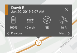 - Tracks—The lines on the map are the tracks of mobile users. Click a track to see details about that point along the track, including the mobile user to whom it belongs, the time stamp, the device's battery level, the speed and activity type, the direction the user was heading, and the GPS accuracy of that track point. You can access previous and next track points for that mobile user by clicking Previous and Next at the bottom of the details.